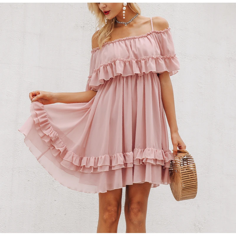 Best Dresses Off shoulder strap chiffon summer dress Women ruffle pleated short dress pink Elegant holid